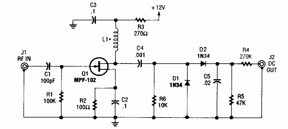 Encontrado numa Popular Electronics dos anos 90, este circuito monitora um sinal de RF fornecendo uma saída DC. O circuito pode funcionar com frequências até 100 MHz. A bobina L1 depende da frequência ficando entre 100 uH a 1 000 uH.