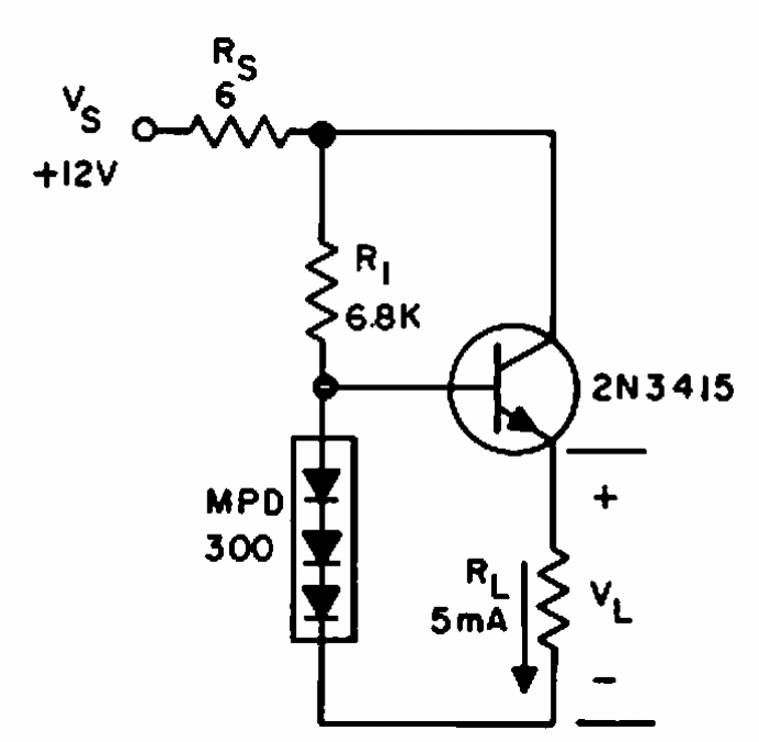 Encontrado em documentação da General Electric de 1966, este circuito usa um diodo triplo da época. A corrente de saída é de 5 mA. Serve como referência de tensão.