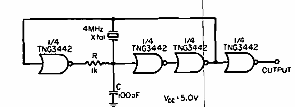Este circuito fornece um trem de pulsos de 4 MHz ou em outra frequência determinada pelo cristal durante o período de carga da rede RC. Encontramos em uma EEE de 1968. O circuito funciona como shield.