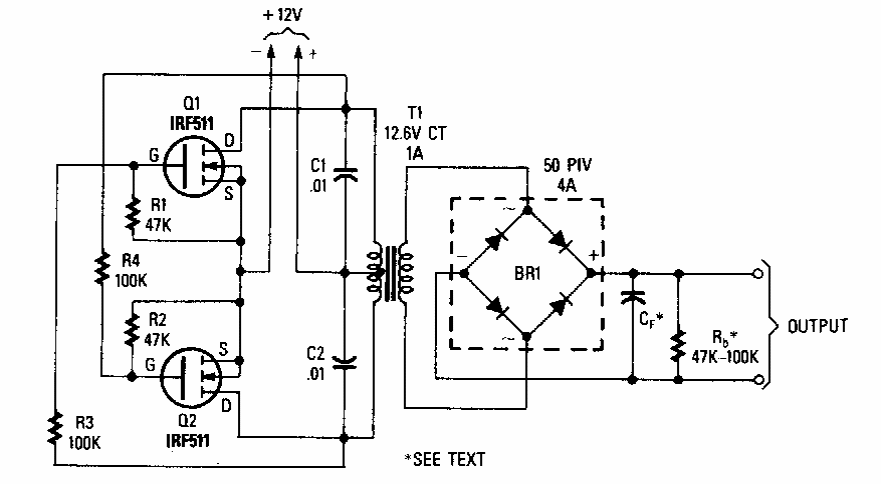 A tensão de saída deste inversor depende do transformador usado. O circuito é de uma Popular Electronics dos anos 90. O circuito se aplica a qualquer pequeno transformador de 12 V CT com até 1 A e primário de 110, 220 ou 240 V.