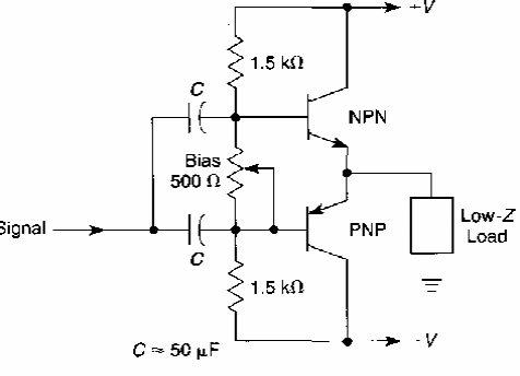 Este circuito pode ser usado com transistores comuns, desde uso geral até média potência. O circuito é de uma documentação americana dos anos 90. A alimentação depende dos transistores e da potência.