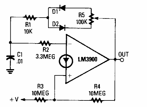 Encontrado numa Radio Electronics dos anos 90, este circuito usa um amplificador operacional de transcondutância. A frequência central do oscilador é dada por C1.