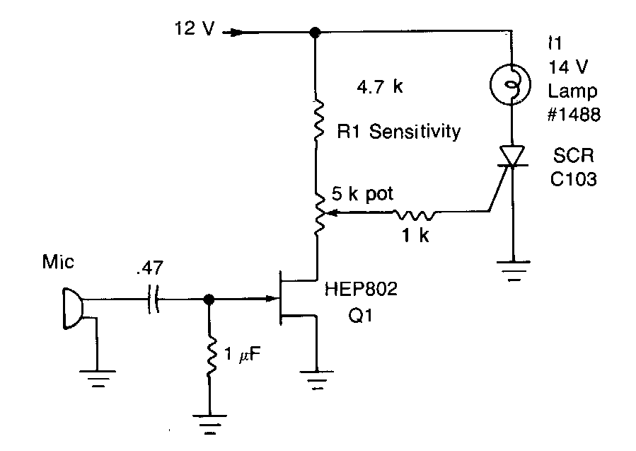 Encontrado em documentação americana dos anos 80, este circuito pode ser elaborado com componentes equivalentes. O microfone pode ser do tipo piezoelétrico.
