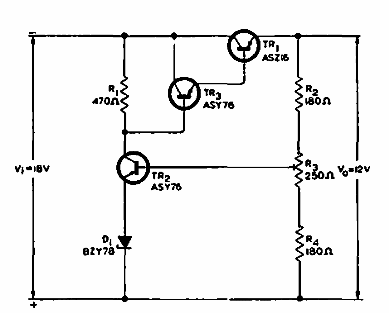 Com entrada de 18 V, este regulador foi encontrado em documentação da Philips dos anos 60. Os transistores são da época. O transistor de potência deve ser dotado de dissipador.