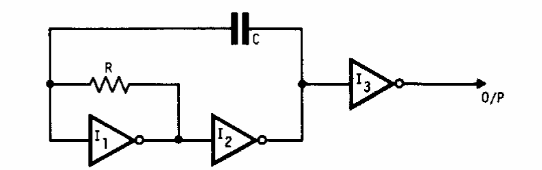 Este circuito para baixas frequências foi encontrado em documentação dos anos 80. Os valores de R e C determinam a frequência. Os inversores podem ser elaborados também com portas lógicas.