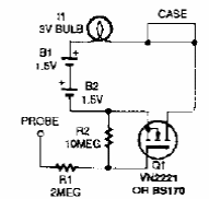 Este circuito de alta impedância usa uma lâmpada de 12 V servindo para testar tensões num carro. Encontramos numa Popular Electronics dos anos 80. O MOSFET pode ser de qualquer tipo equivalente.