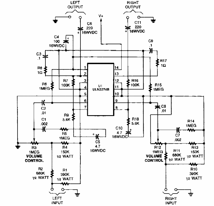 Este circuito foi encontrado numa Popular Electronics dos anos 90. O circuito integrado usado é pouco comum atualmente. A potência é da ordem de 2 W.