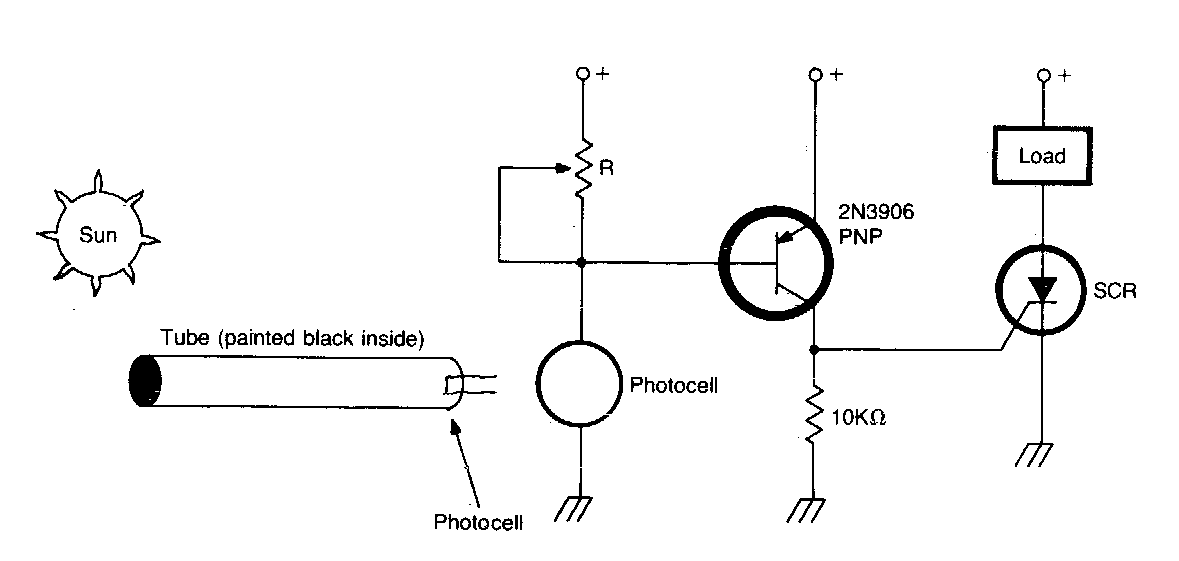 Este circuito faz uso de um sistema de captação que nos tempos modernos pode ser uma fibra óptica. O transistor é comum e o sensor um LDR. A alimentação pode ser de 6 a 12 V conforme o relé. R tem 1M ohms.