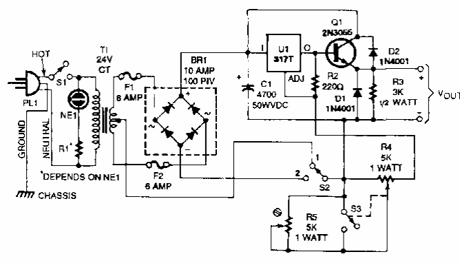 Com esta fonte é possível usar na bancada aparelhos automotivos com correntes até uns 8 A. O circuito é de uma Popular Electronics dos anos 80. O transistor deve ser dotado de bom dissipador de calor.