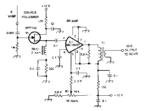 Neste circuito dos anos 80, o transformador T1 tem 30 espiras de fio 28 de primário e o secundário 4 espiras. O circuito funciona até uns 30 MHz. O circuito integrado é raro em nossos dias.