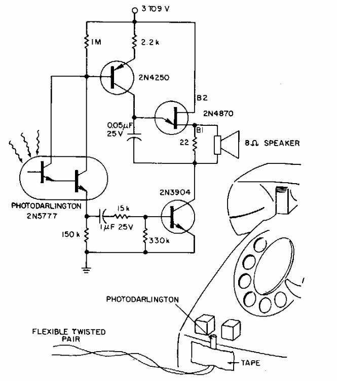 Este circuito se aplica a um telefone de disco antigo detectando os pulsos de luz na discagem. O circuito é de uma antiga Electronic Design dos anos 80.