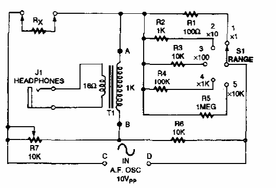 Encontrado numa Popular Electronics dos anos 80, esta ponte permite a medida de resistências em 5 faixas de valores. A fonte de sinal é um oscilador e o detector de nulo um fone de ouvido.