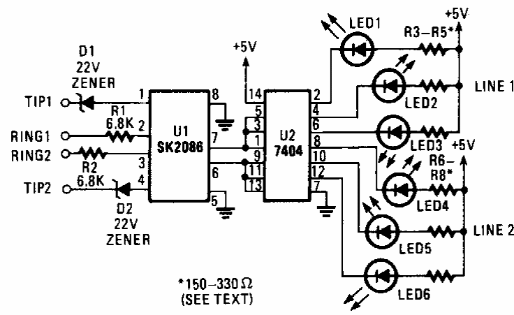 Encontrado numa Popular Electronics dos anos 90, este circuito é empregado para indicar a operação de telefones da época. O circuito é TTL.