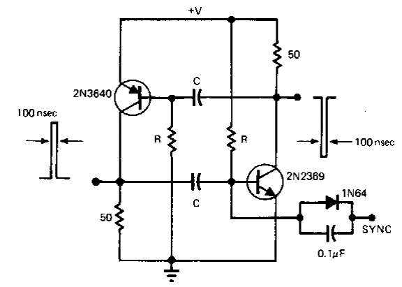 Pulsos de curta duração podem ser encontrados neste circuito de uma EDN dos anos 90. A carga é de 50 ohms e os transistores são da época.