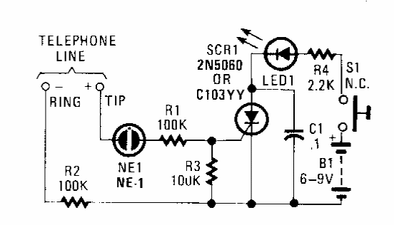 Utilizado com telefones da época, este circuito foi encontrado numa Popular Electronics dos anos 90. O circuito faz com que o LED fique aceso até que S1 seja desligado.
