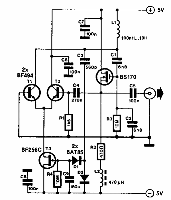 Encontrado em uma Elektor Electronics dos anos 90, este circuito pode gerar sinais de 1 kHz a 9 MHz, dependendo dos componentes usados. Os transistores são comuns admitindo equivalentes.