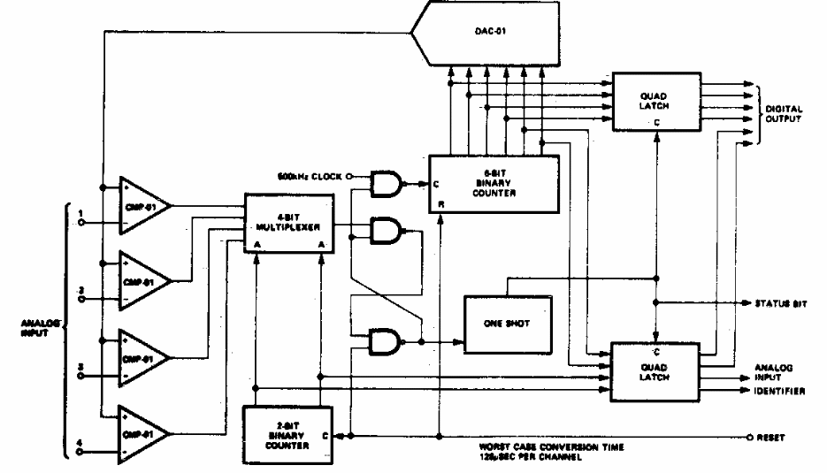 Este conversor de 8 canais foi encontrado numa documentação americana dos anos 70. Os circuitos integrados usados não são muito comuns atualmente.
