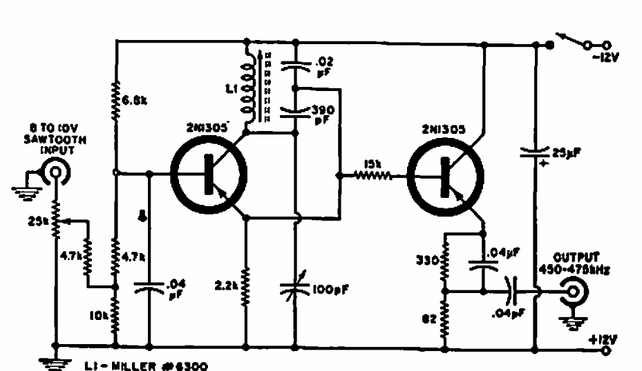 Encontrado numa Electronics World de 1967, este circuito gera um sinal com varredura de 25 kHz para teste de equipamentos de SSB o circuito tem uma banda lateral de 460 e 466 kHz.