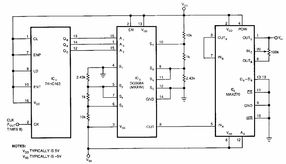Este circuito gera um sinal senoidal com apenas -80 dB de THD. O circuito foi encontrado numa EDN dos anos 90. A frequência é de 25 kHz e os componentes usados são da época.