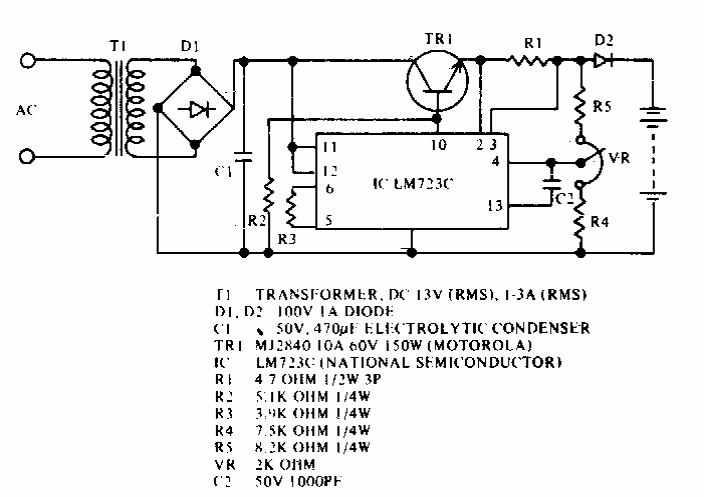Este carregador para uso automotivo fornece uma corrente de saída de 0,42 A. Encontramos numa documentação americana dos anos 90. O transistor deve ser dotado de dissipador de calor.