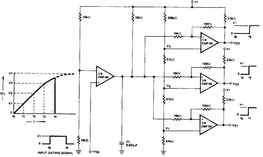Encontramos este circuito numa documentação americana dos anos 80. Os circuitos integrados são operacionais da época. Podemos testar comparadores modernos como o LM339.