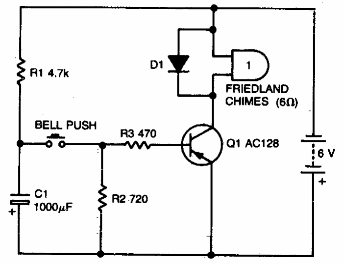Encontrado numa documentação americana dos anos 80, este circuito prolonga o toque de uma campainha acionada por uma tensão contínua de 6 V. O transistor pode ser um BD136.