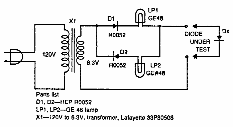 Esse simples teste de diodo aparece em outros pontos desta seção. O circuito pode ser adaptado para usar LEDs em lugar de lâmpadas comuns.