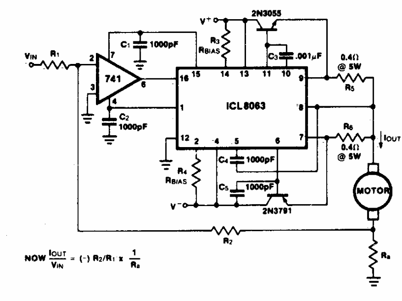 Este controle de corrente para motores de corrente contínua foi encontrado em documentação dos anos 70. A corrente depende dos transistores que admitem equivalente modernos.