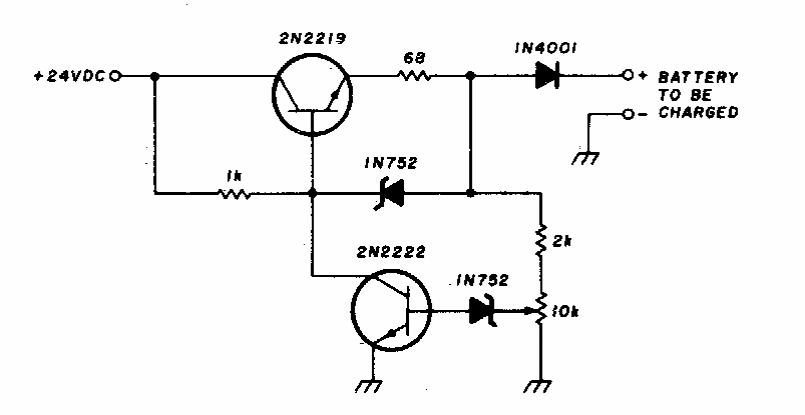 Este pequeno regulador com transistores pode fornecer correntes de 75 mA para a carga de baterias recarregáveis de NiCad. O circuito é da década de 90, usando componentes da época.