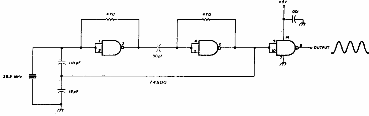 Encontrado numa documentação dos anos 80, este oscilador usa um integrado TTL Schottly. A alimentação deve ser feita com 5 V.