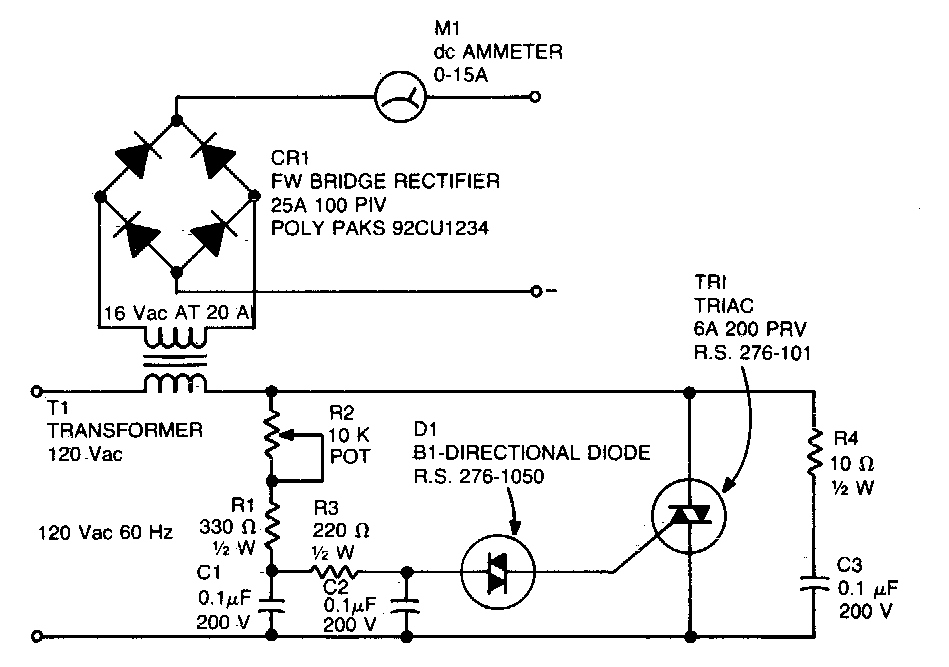 Este circuito foi encontrado numa documentação americana dos anos 90. Ele consiste num variac com um triac no qual se pode controlar a corrente de carga, monitorada por um amperímetro.