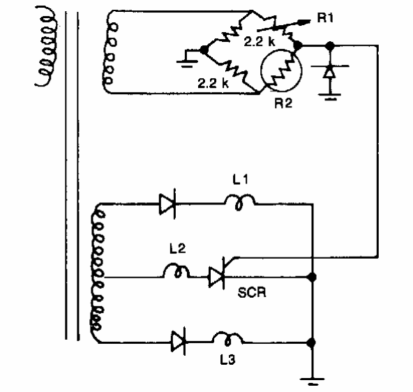 Este circuito com relé foi encontrado numa documentação americana dos anos 90. Os enrolamentos do transformador são de acordo com a tensão de disparo dos relés. O sensor é um NTC de 2,2 k.