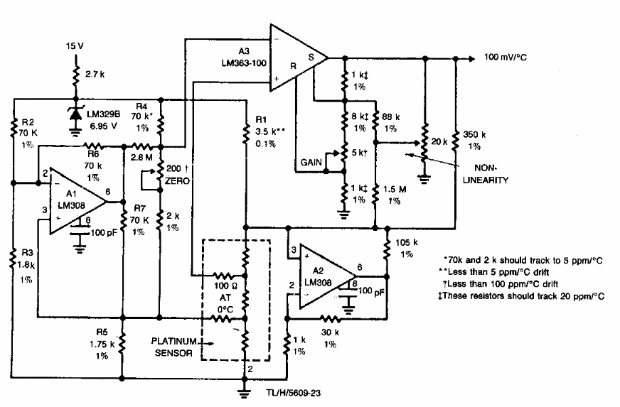 Encontrado em documentação da National Semiconductor dos anos 90, este circuito corrige a curvatura da curva de resposta de um sensor de temperatura RTD. Os componentes usados são da época.