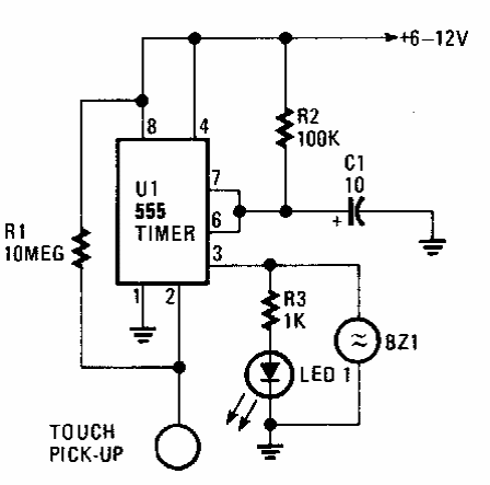 Esta chave de toque temporizada com o 555 foi encontrada numa Hands-On Electronics dos anos 90. Ela aciona um buzzer, mas em seu lugar pode ser usado um relé. Nunca a alimente por fonte sem transformador.