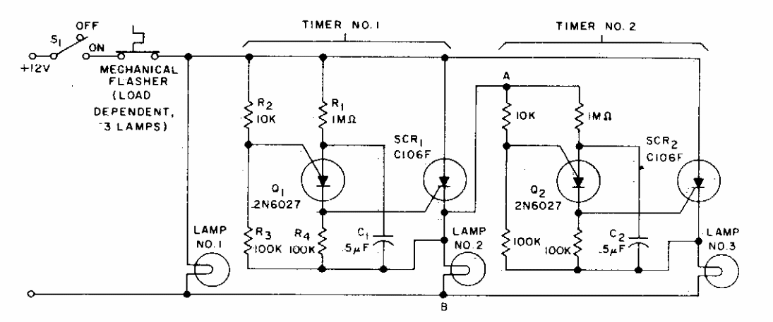 Este circuito foi encontrado em publicação americana dos anos 90. A mesma configuração aparece em diversos pontos deste site, obtida de diversas fontes. As lâmpadas podem ser substituídas por LEDs.