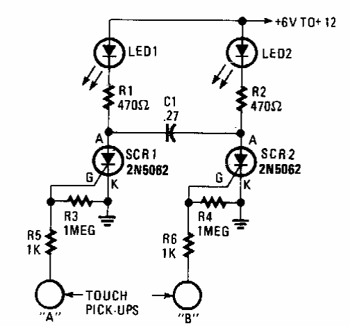 Encontrado numa Hands-On Electornics este biestável de toque pode controlar cargas que dependem do SCR utilizado. A fonte deve usar transformador de isolamento.