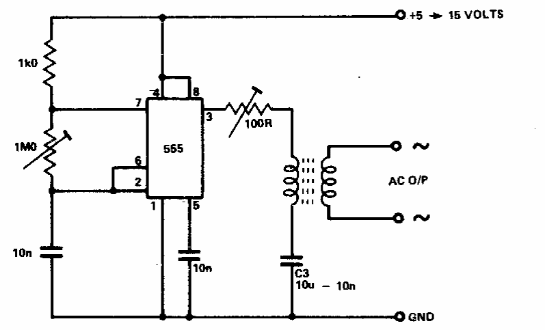 Este inversor com o 555 fornece uma saída de alta tensão, mas muito baixa corrente. Encontramos numa documentação dos anos 80. O transformador é de acordo com a tensão desejada.