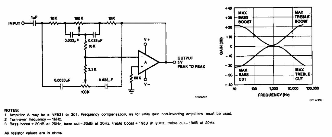 Este controle de tom foi obtido em documentação da Signetics dos anos 90. O circuito integrado pode ser praticamente qualquer amplificador operacional. A fonte é simétrica.