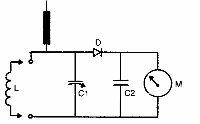 Este circuito, que faz uso de um diodo de germânio, pode trabalhar com sinais de 1,5 a 150 MHz. C1 é um variável comum e C2 tem 4,7 nF de cerâmica. L depende da frequência. O indicador é de 50 uA.