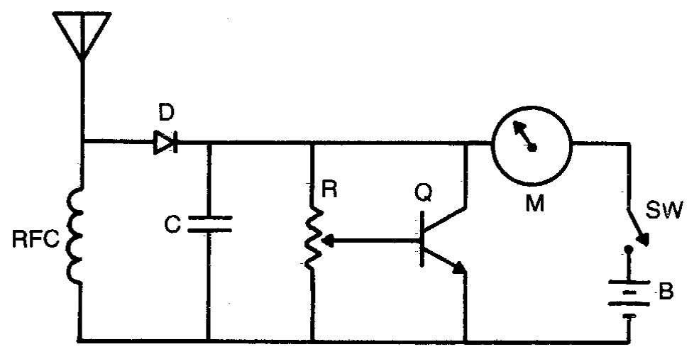 O choque é de 2,5 mH para frequências entre 3 e 30 MHz. C é de 1 nF, R de 47 k e o transistor pode ser de qualquer tipo de uso geral. M é de 0-1 mA e a alimentação feita com tensões de 3 a 6 V.