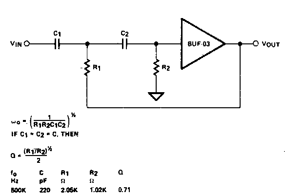 Este circuito para frequências elevadas foi encontrado numa documentação dos anos 80. O operacional deve ser acordo coma frequência e a fonte de alimentação deve ser simétrica.