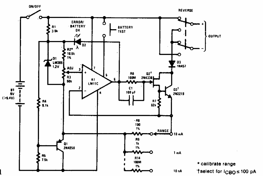 Este circuito de precisão para testes de bancada pode fornecer correntes em escalas de 10 uA a 10 mA. O circuito é de uma documentação dos anos 80. Os componentes são da época.