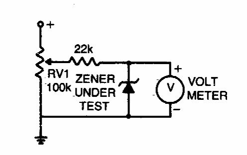Este circuito usa uma fonte fixa que deve ter uma tensão maior do que a do diodo zener que será testado. O voltímetro pode ser um multímetro comum na sua escala de tensão de acordo com o zener.