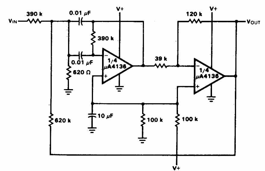 Encontrado nu manual antigo este circuito usa um duplo 741, indicado como uA4136. O circuito não exige fonte simétrica. Podem ser usados operacionais equivalentes.