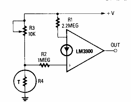 Encontrado numa Radio Electronics dos anos 90, este circuito usa como sensor um termistor que pode ter uma resistência à temperatura ambiente entre 10 e 50k. R3 pode ter valores entre 10 e 100 k, conforme o termistor.