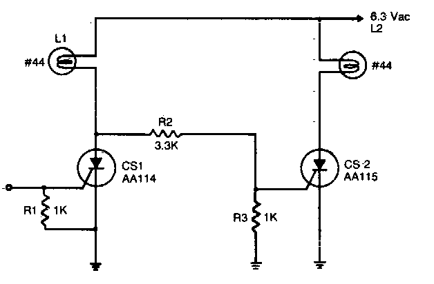 Com este circuito é possível controlar simultaneamente duas lâmpadas incandescentes de baixa tensão. Os SCRs são dos anos 70, admitindo equivalentes modernos.