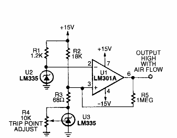 Este circuito faz uso de um sensor termométrico que se aquece ou esfria conforme uma corrente de ar. O circuito é de uma Popular Electronics dos anos 80. O amplificador operacional admite equivalente.