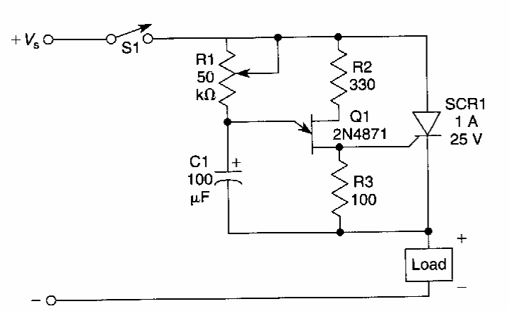 Encontrado numa documentação dos anos 90, este circuito aciona um SCR com um retardo que depende de C1 e pode ser ajustado em R1. A carga depende do SCR usado.