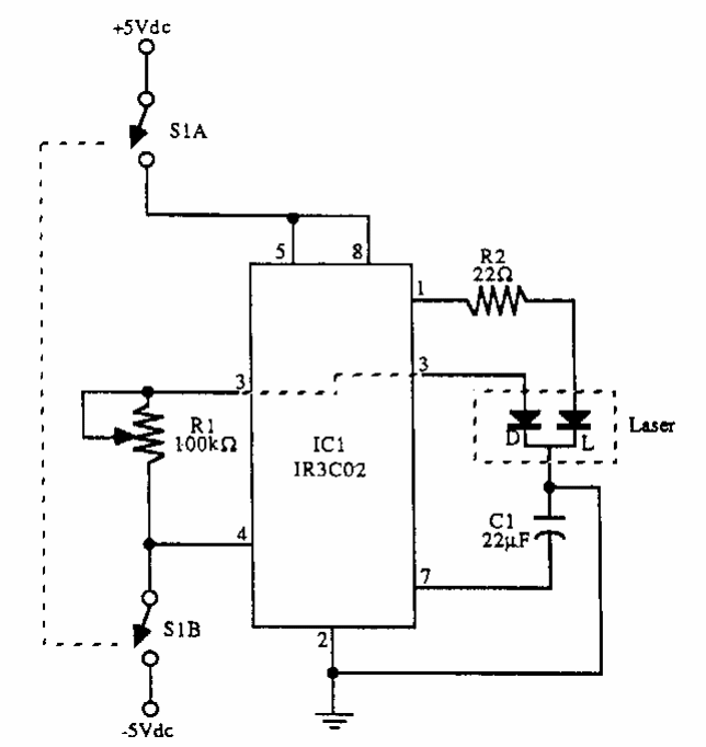 Encontrado numa documentação americana dos anos 90, este simples circuito excita um diodo LASER. O circuito integrado é da Sharp, pouco comum atualmente.