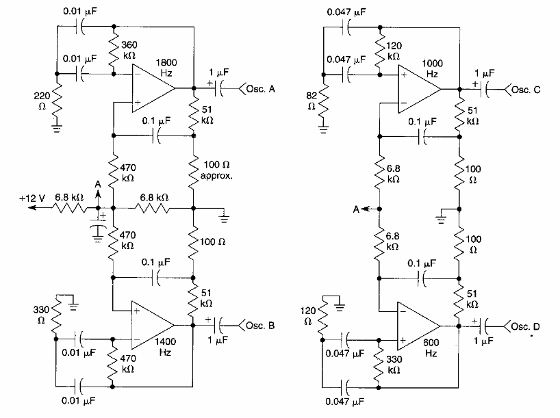 Usando 4 amplificadores operacionais este circuito gera 4 tons diferentes. O circuito é de uma documentação americana dos anos 90. Os amplificadores operacionais são do tipo TL084.